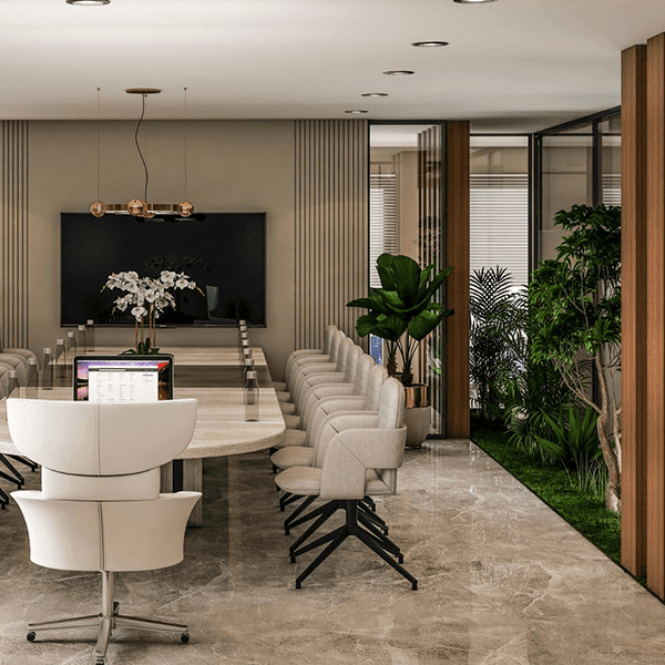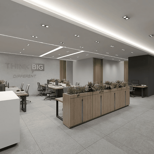 Sleek lines, greenery, and smart lighting for productivity.