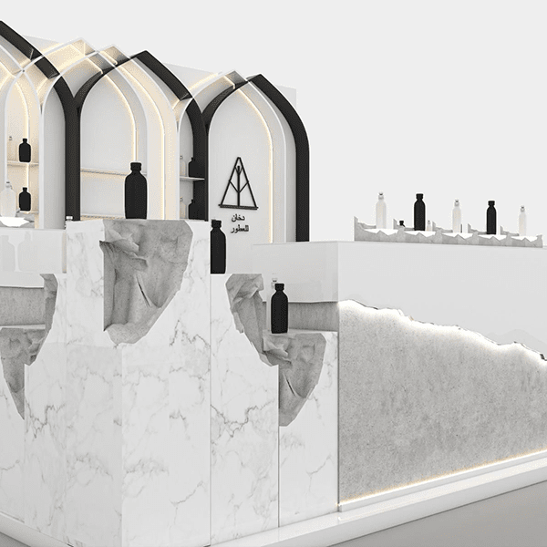 Sculpted forms with elegant lighting to highlight products.