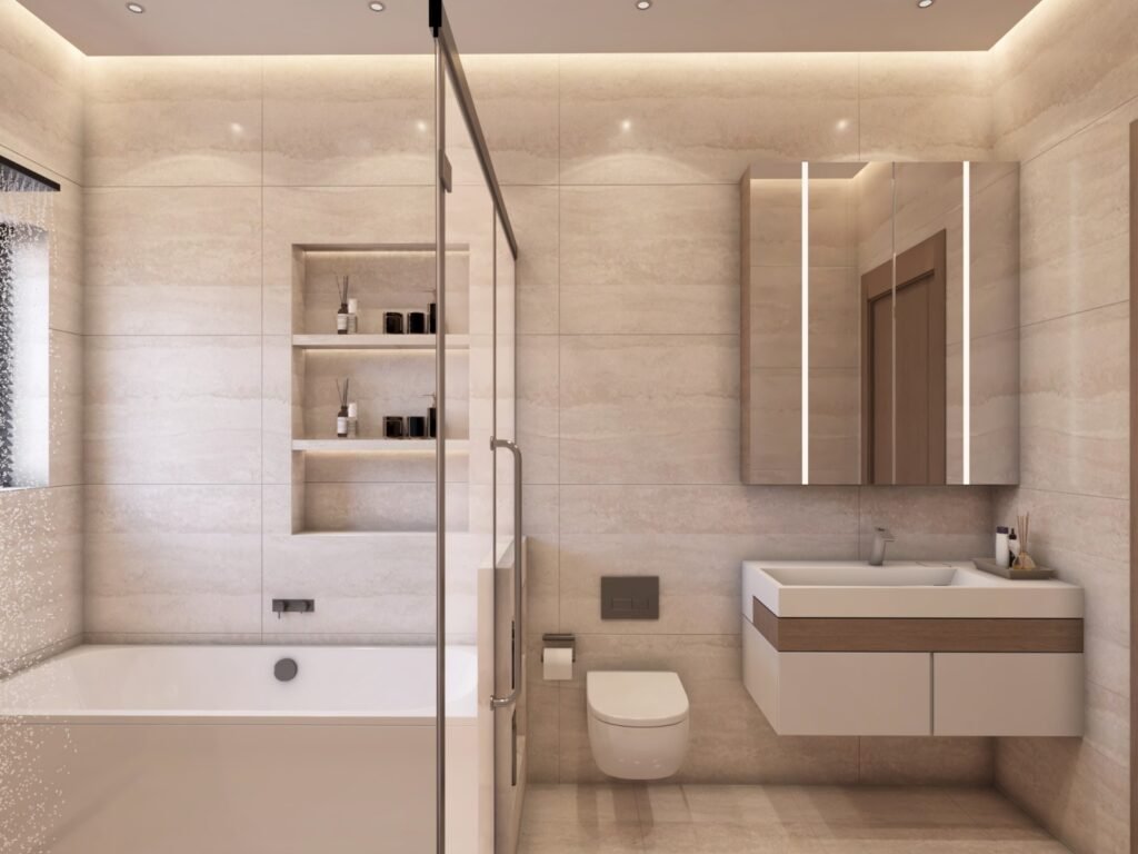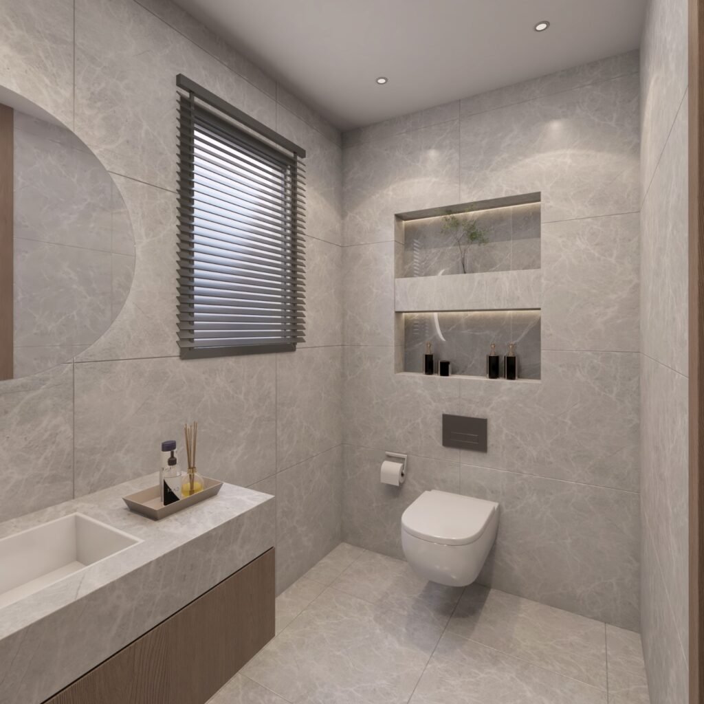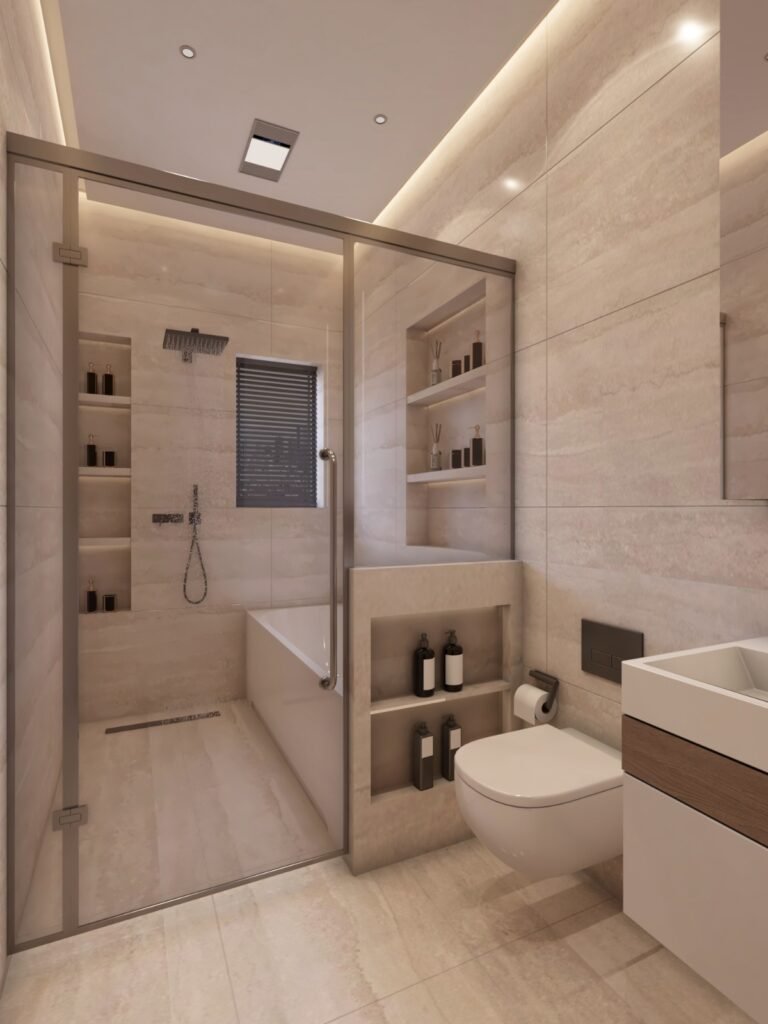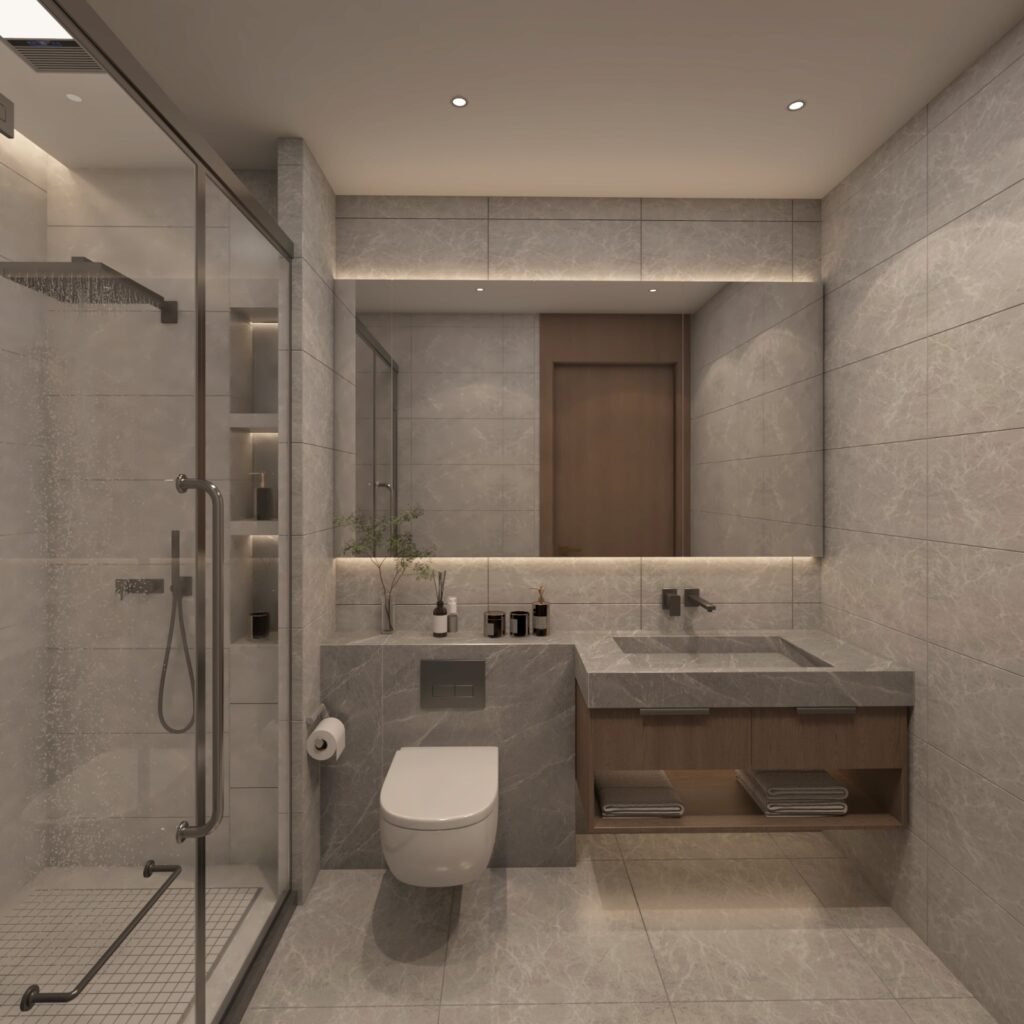 Functional yet stylish bathrooms designed with minimal finishes, space-saving fixtures, and efficient storage solutions.