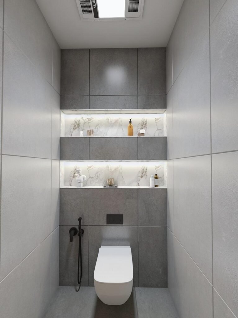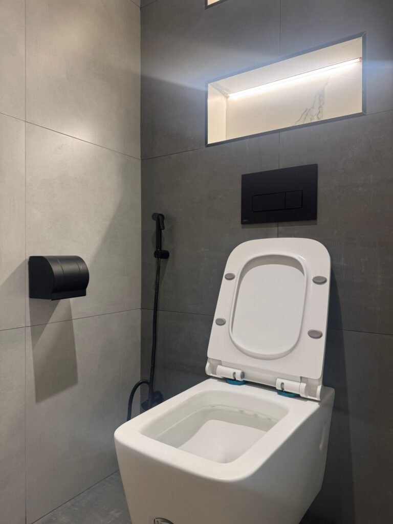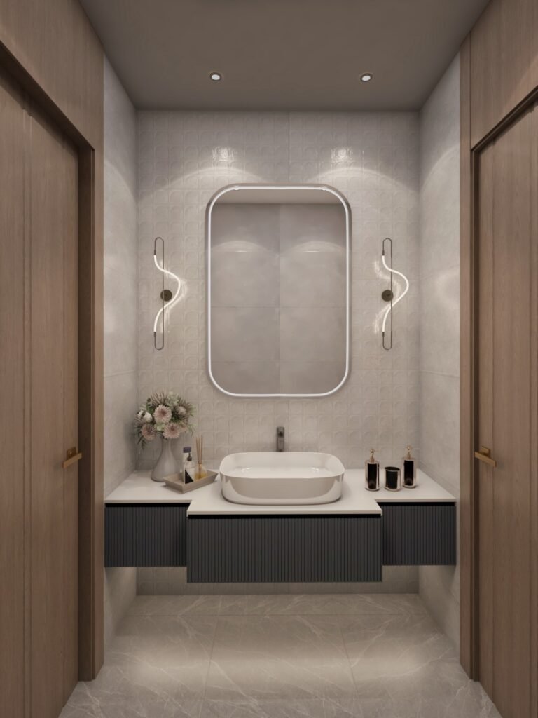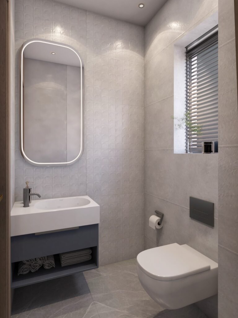 Functional yet stylish bathrooms designed with minimal finishes, space-saving fixtures, and efficient storage solutions.