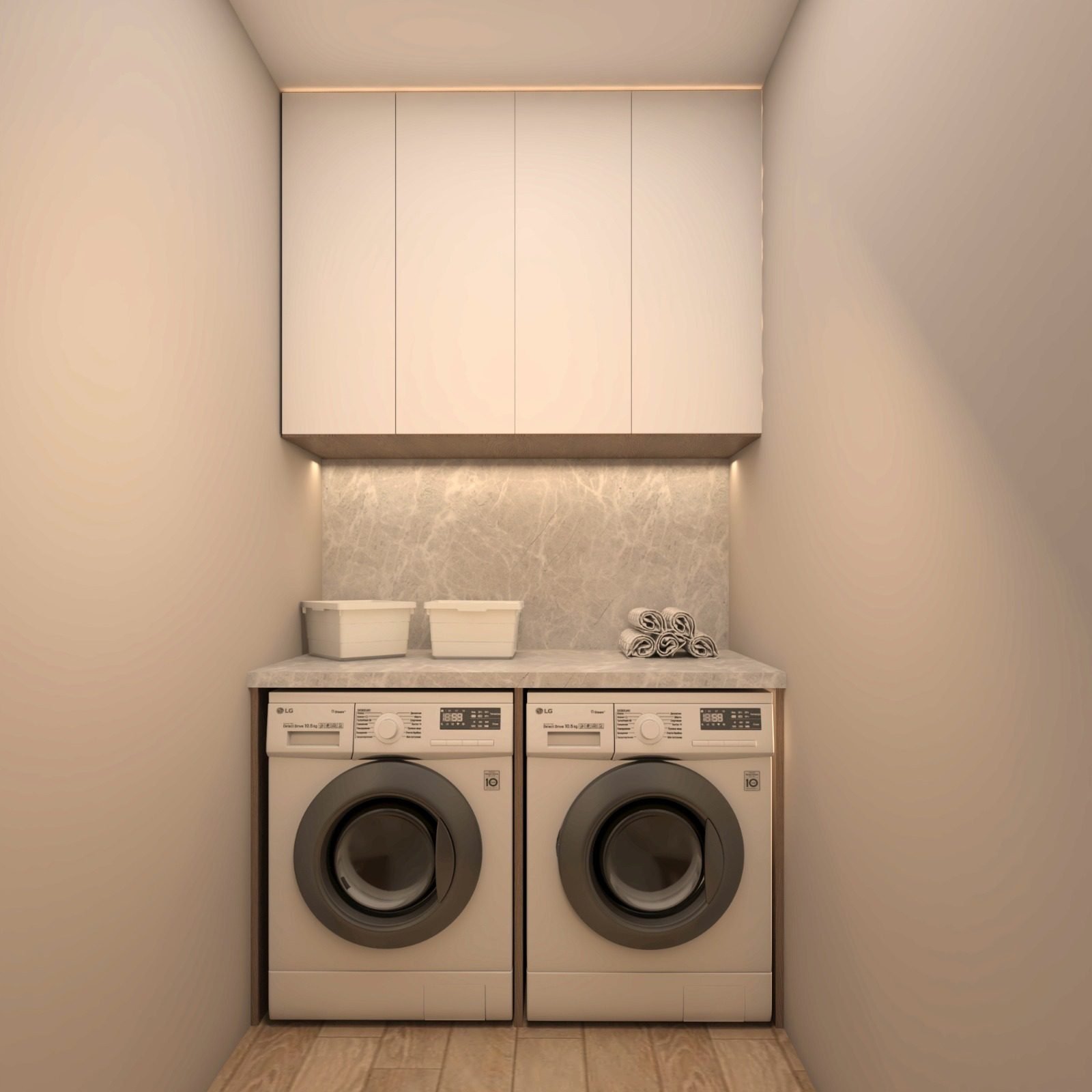 Organized laundry areas with concealed cabinetry, stacked appliances, and clever storage for a seamless home experience.