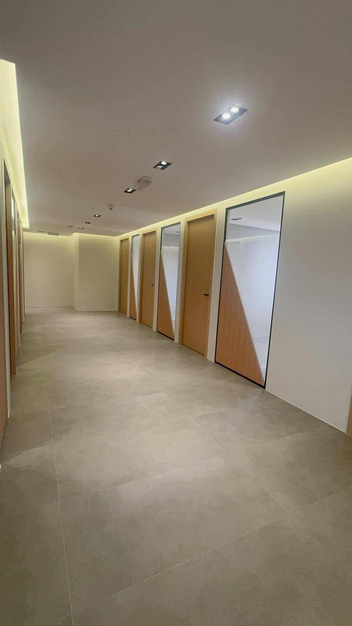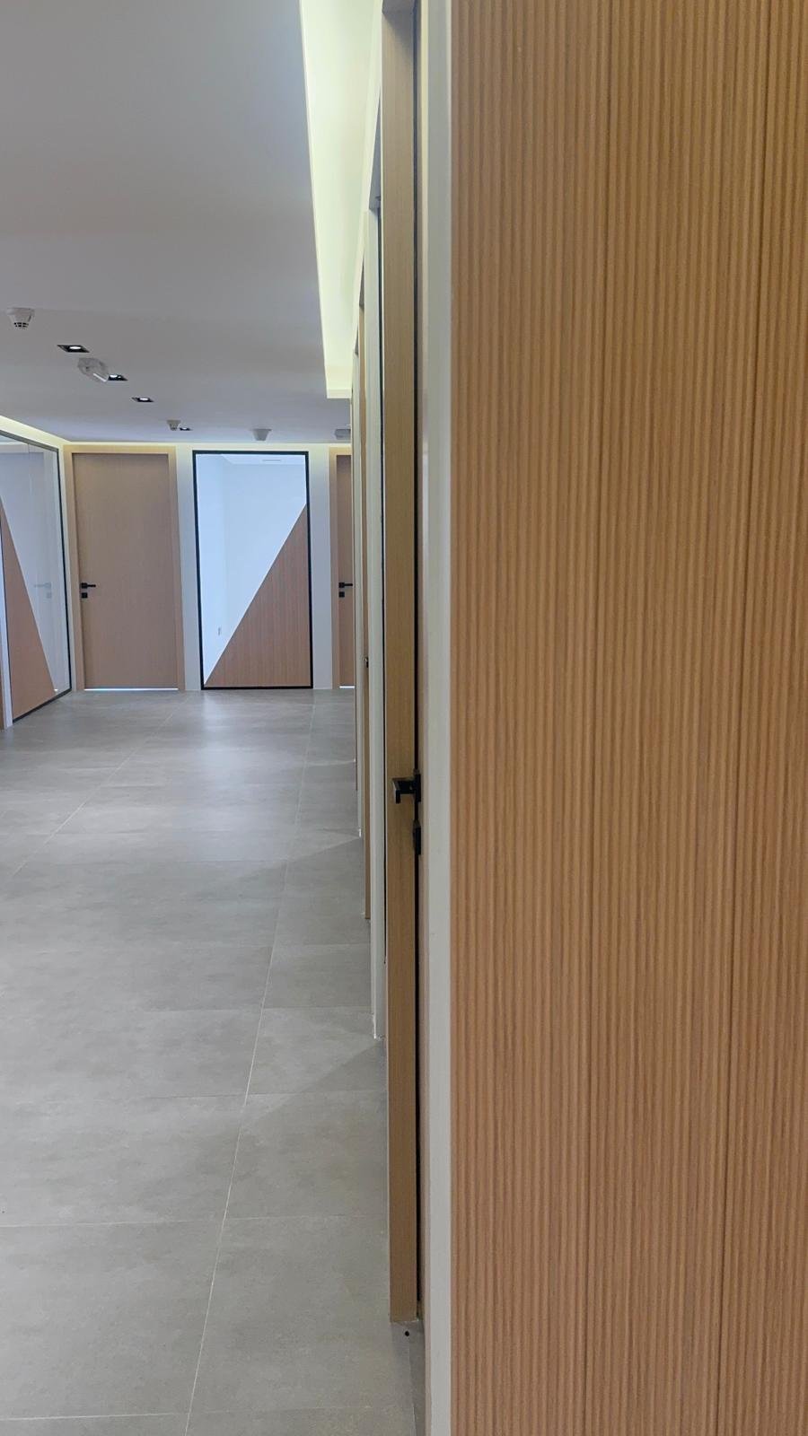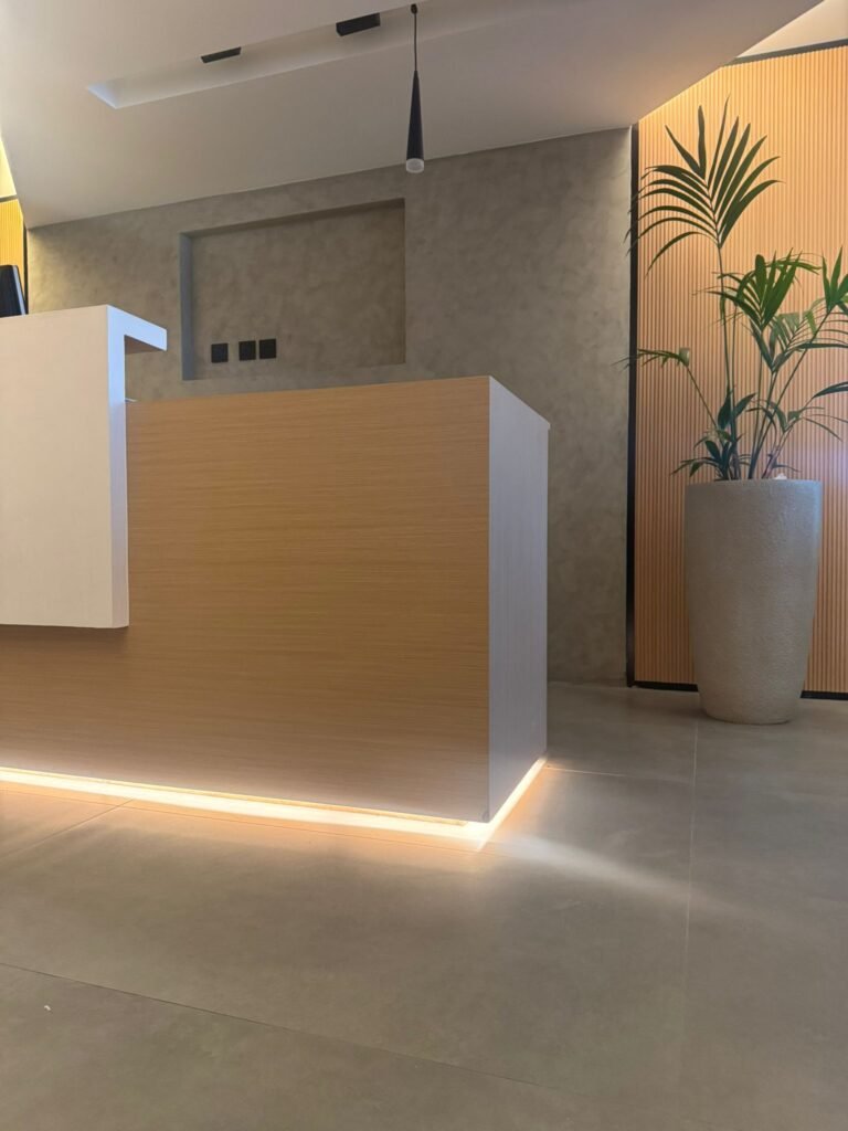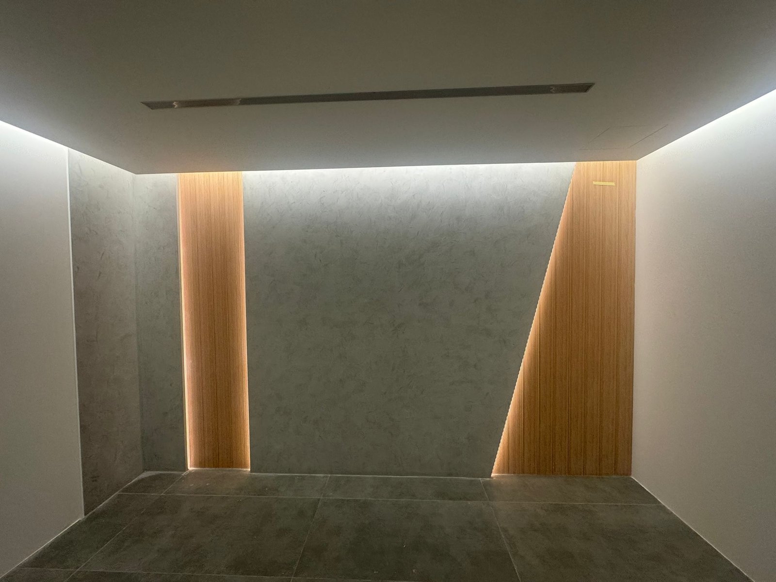 A sleek retail space design featuring warm wood paneling, integrated LED lighting, and minimalist concrete finishes. The clean aesthetic enhances customer flow while creating a modern shopping atmosphere.