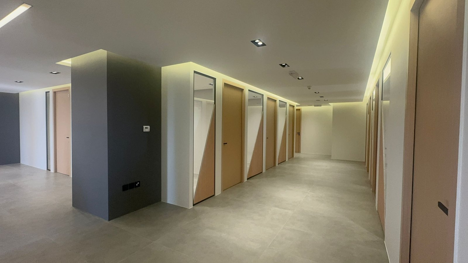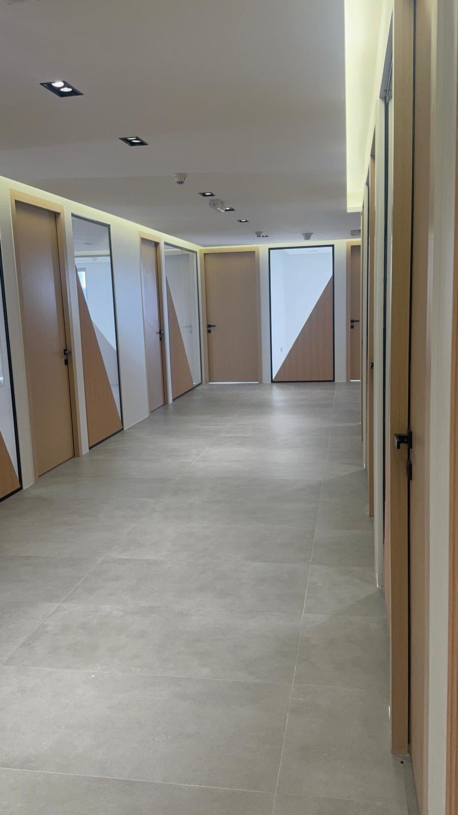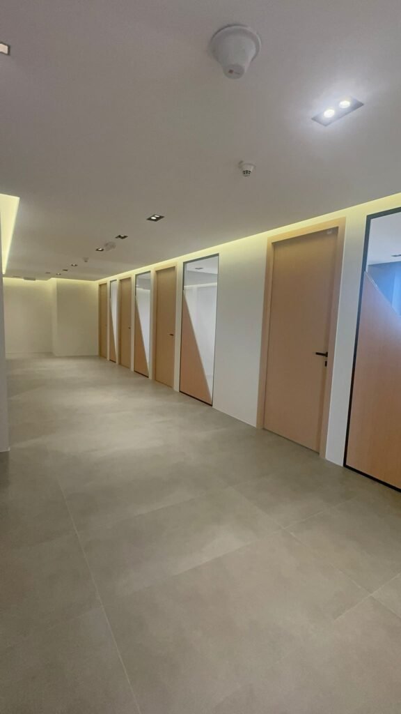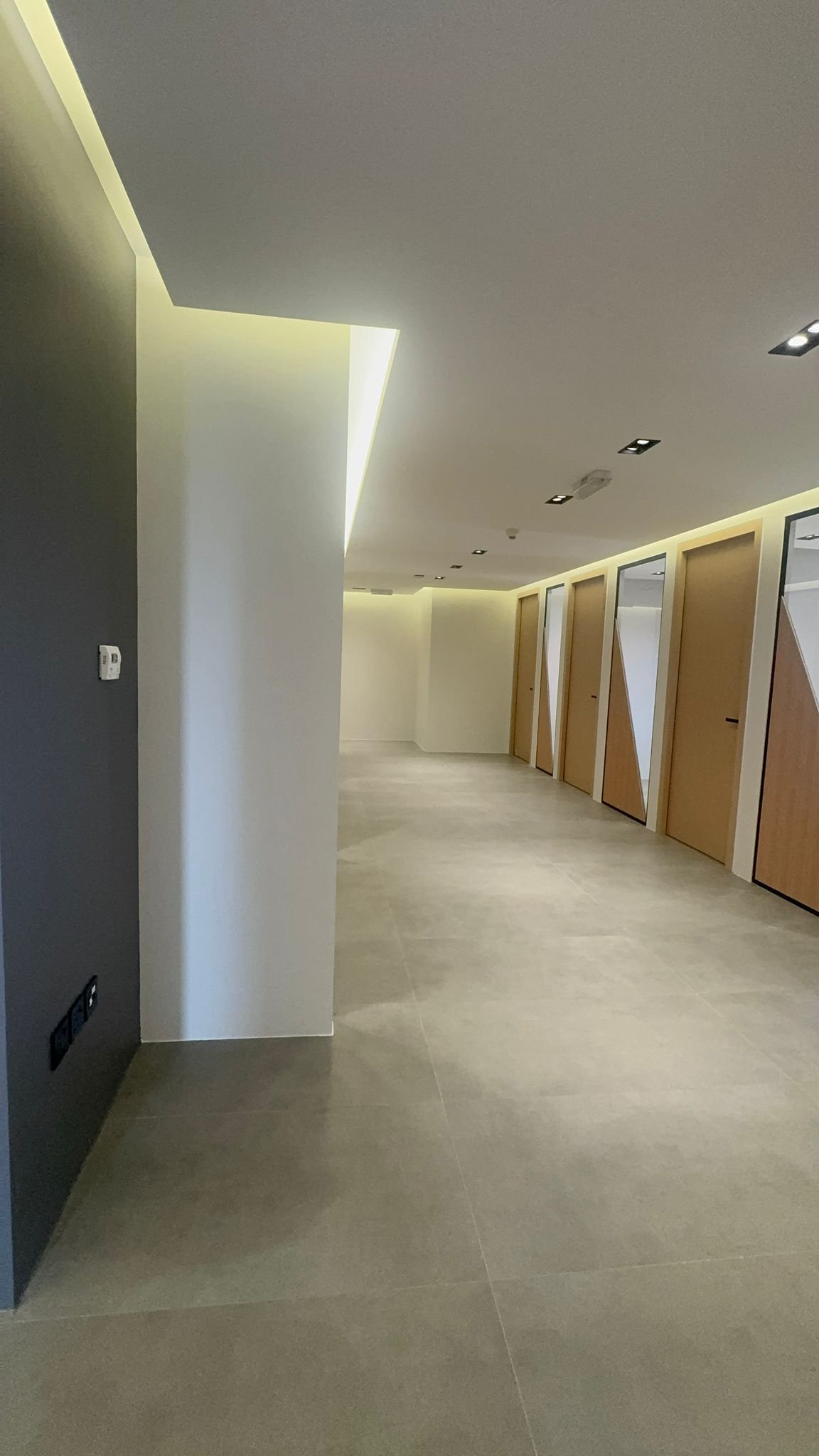 A sleek retail space design featuring warm wood paneling, integrated LED lighting, and minimalist concrete finishes. The clean aesthetic enhances customer flow while creating a modern shopping atmosphere.
