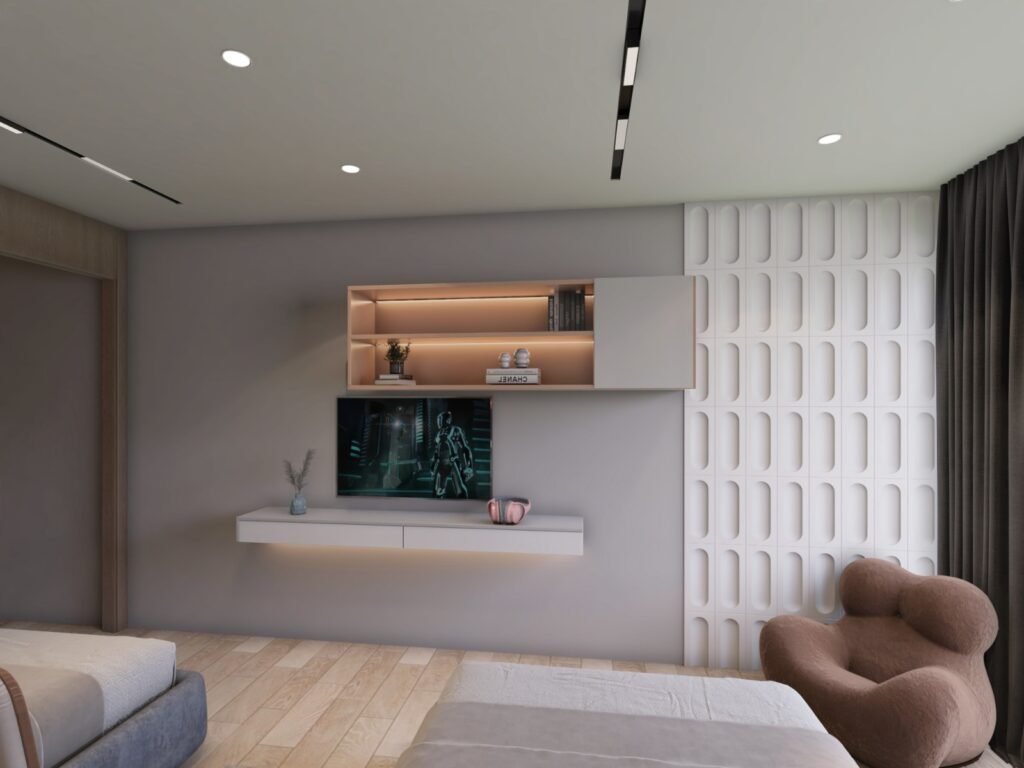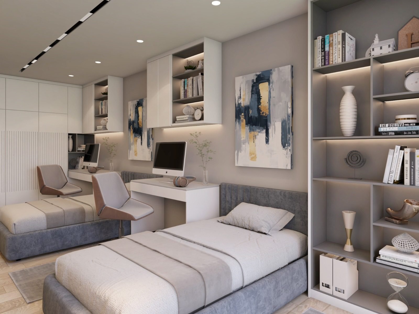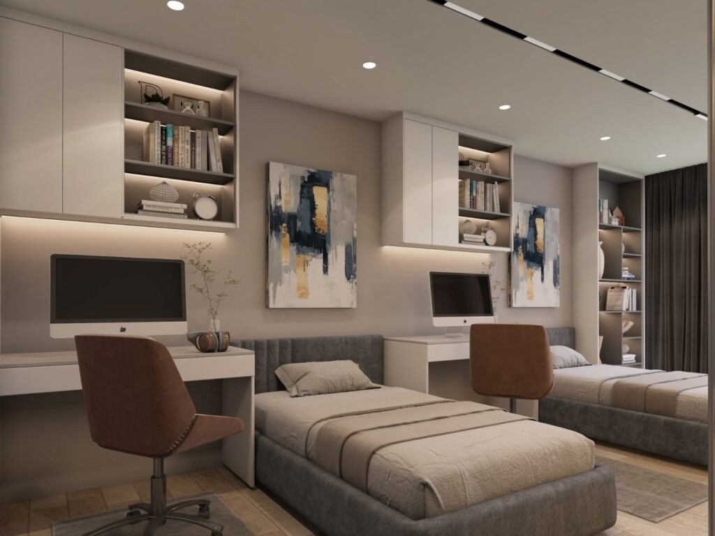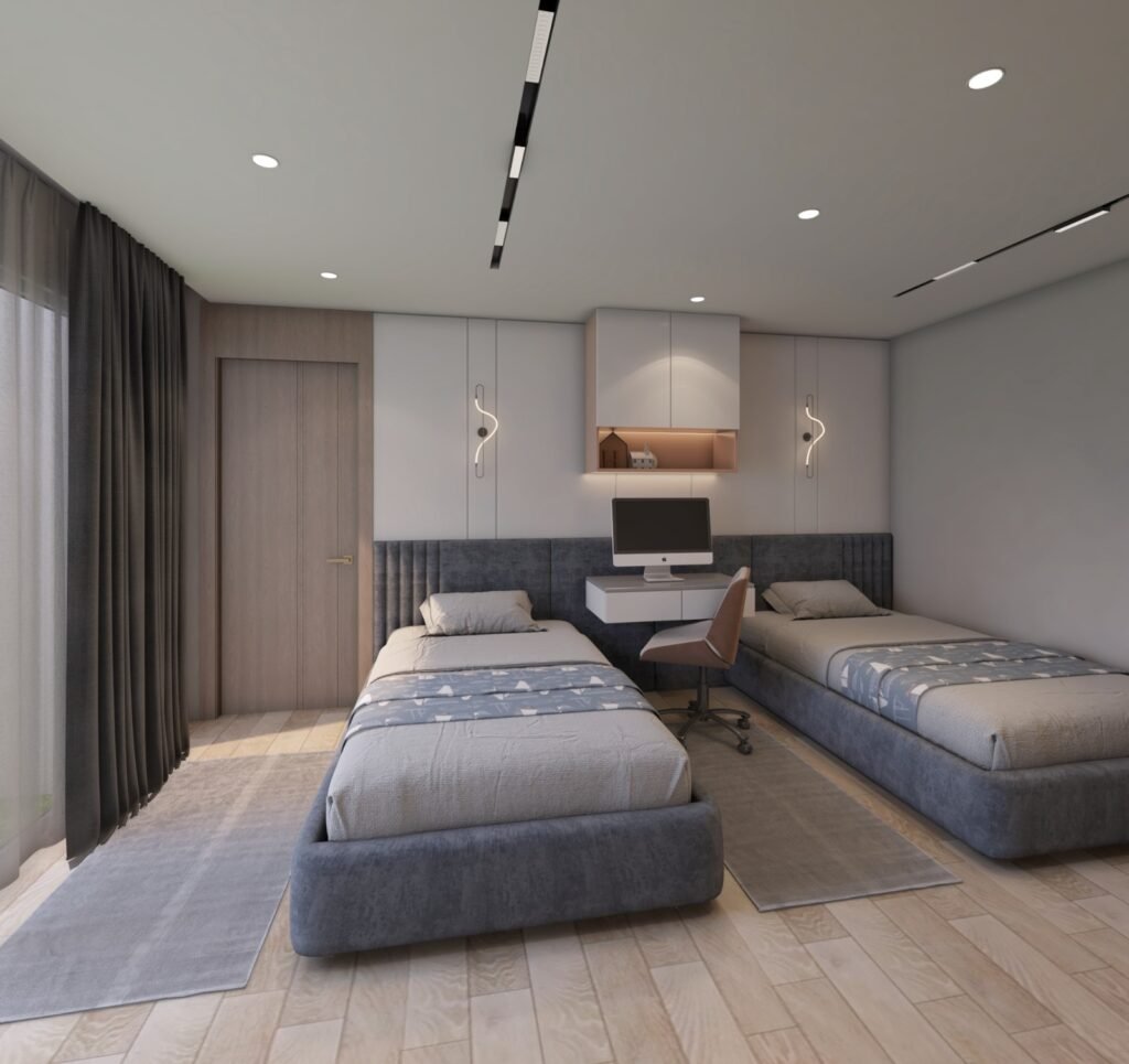 Contemporary bedroom designs featuring twin beds, built-in study areas, and smart storage solutions. A perfect balance of comfort, functionality, and modern elegance for residential living.