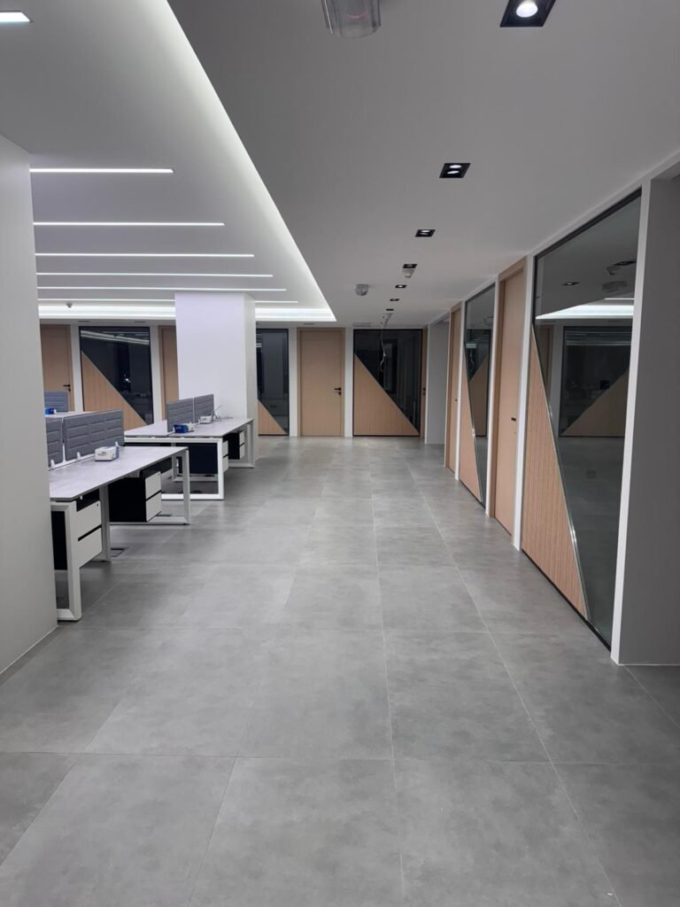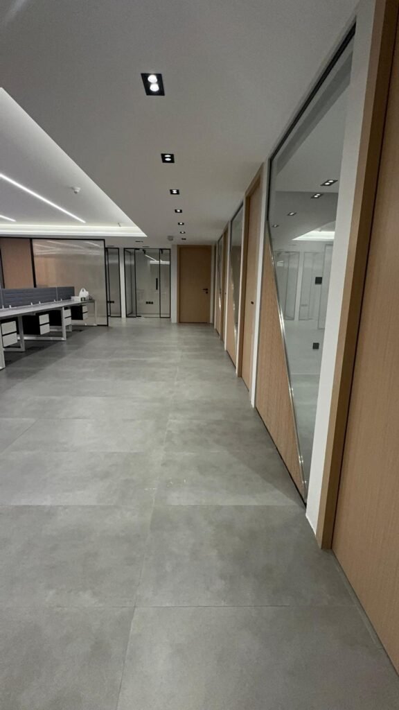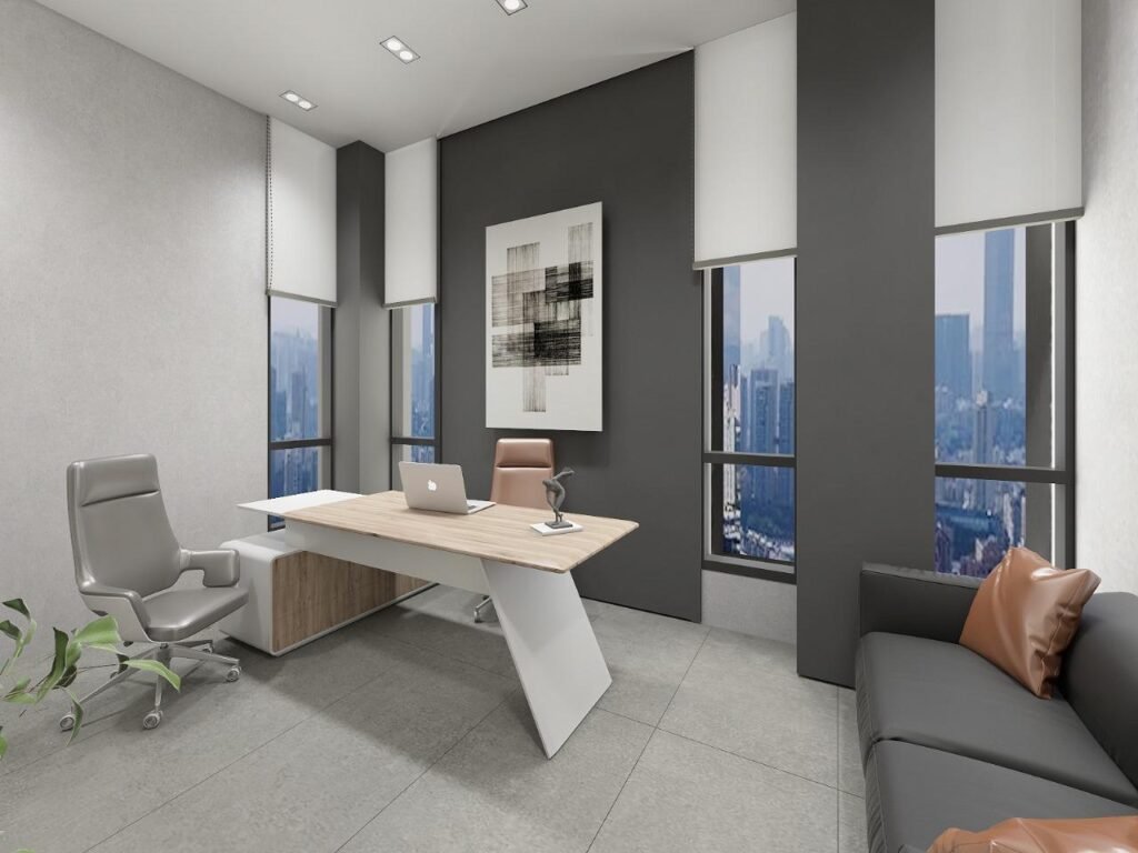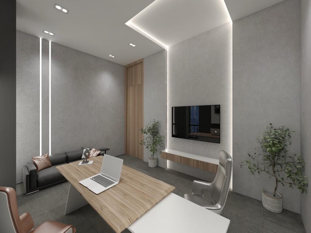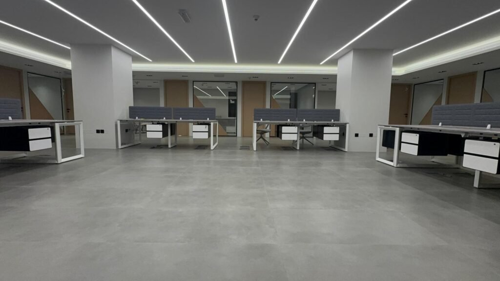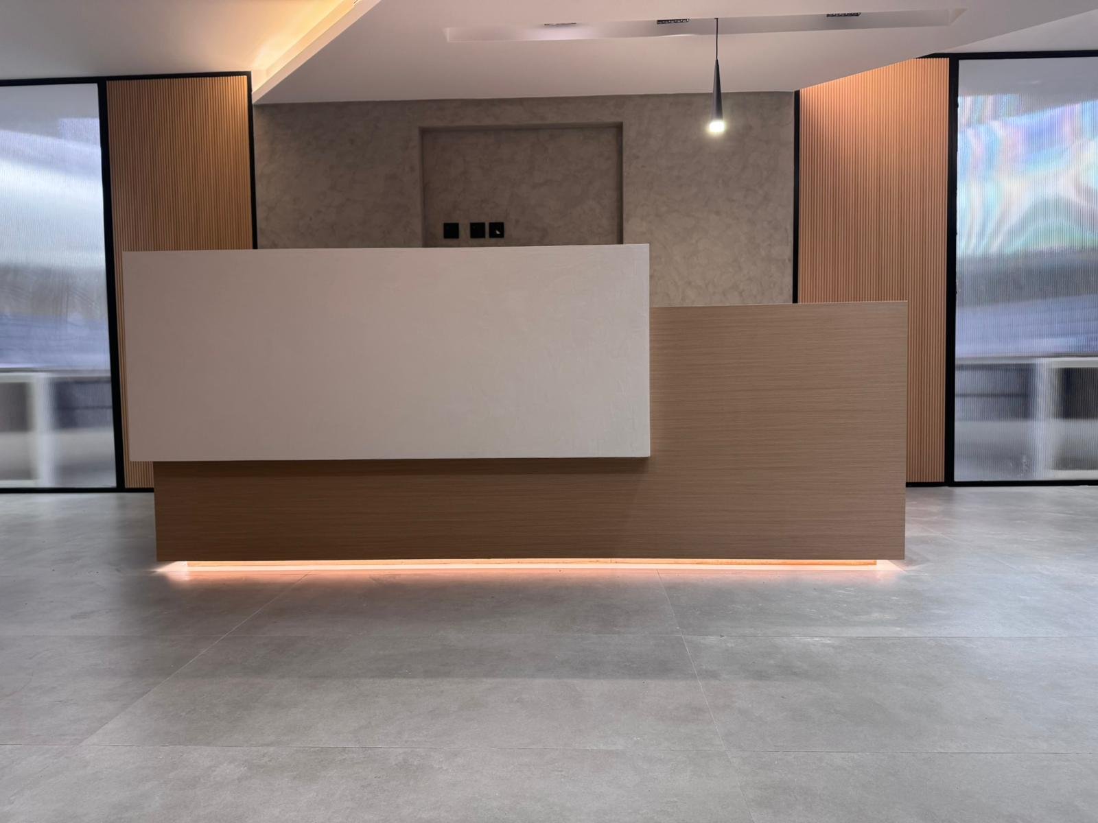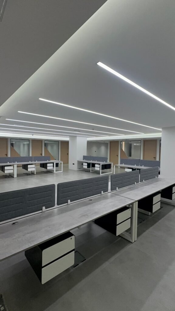 A contemporary office interior combining sleek reception, open-plan workstations, and executive offices. The design emphasizes clean geometry, warm wood, and integrated linear lighting to enhance productivity and sophistication.