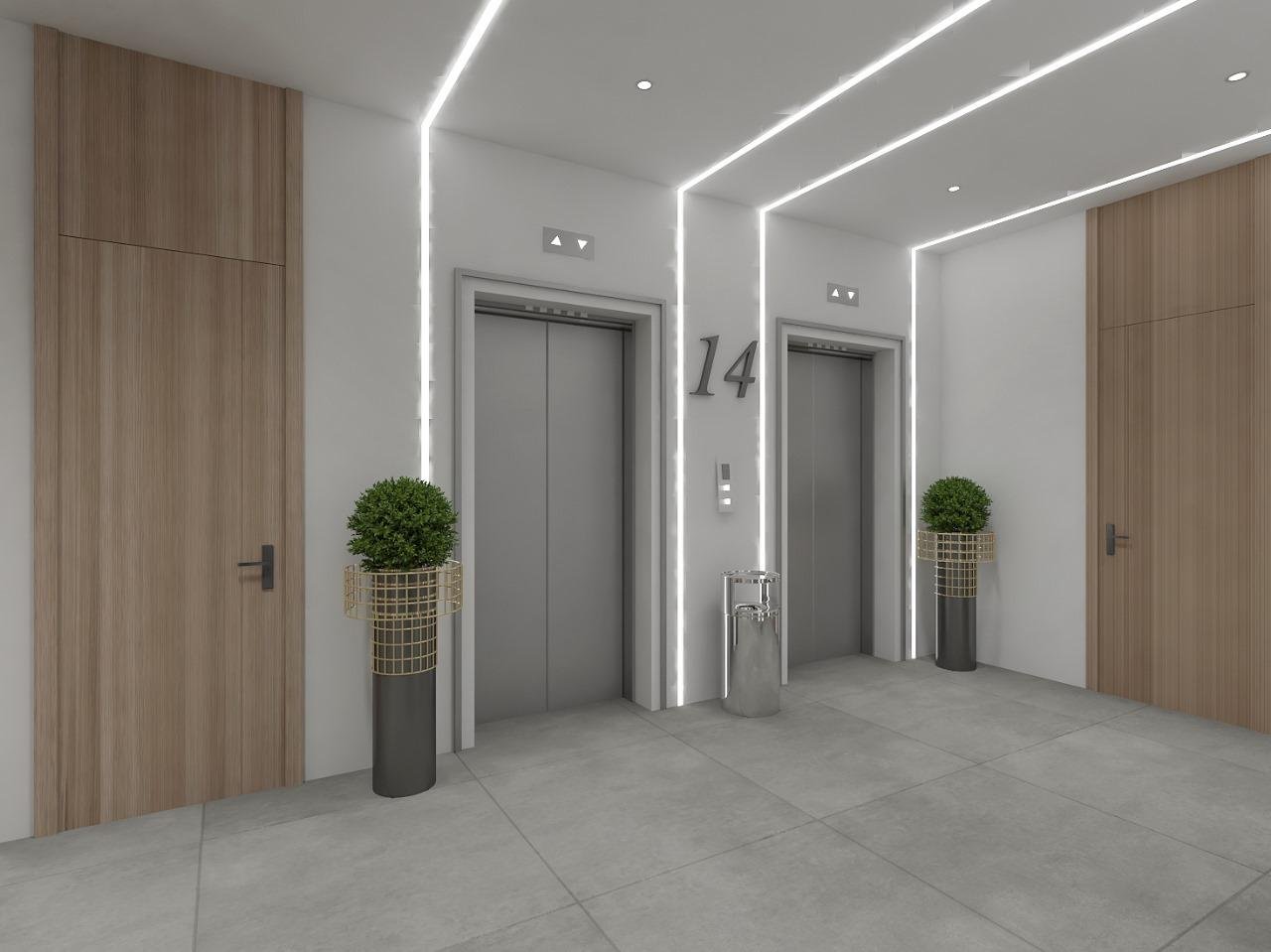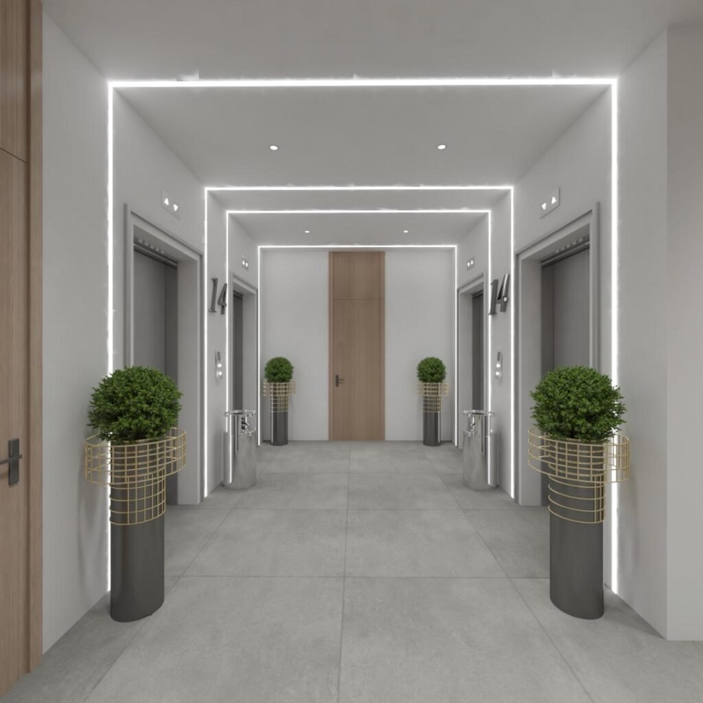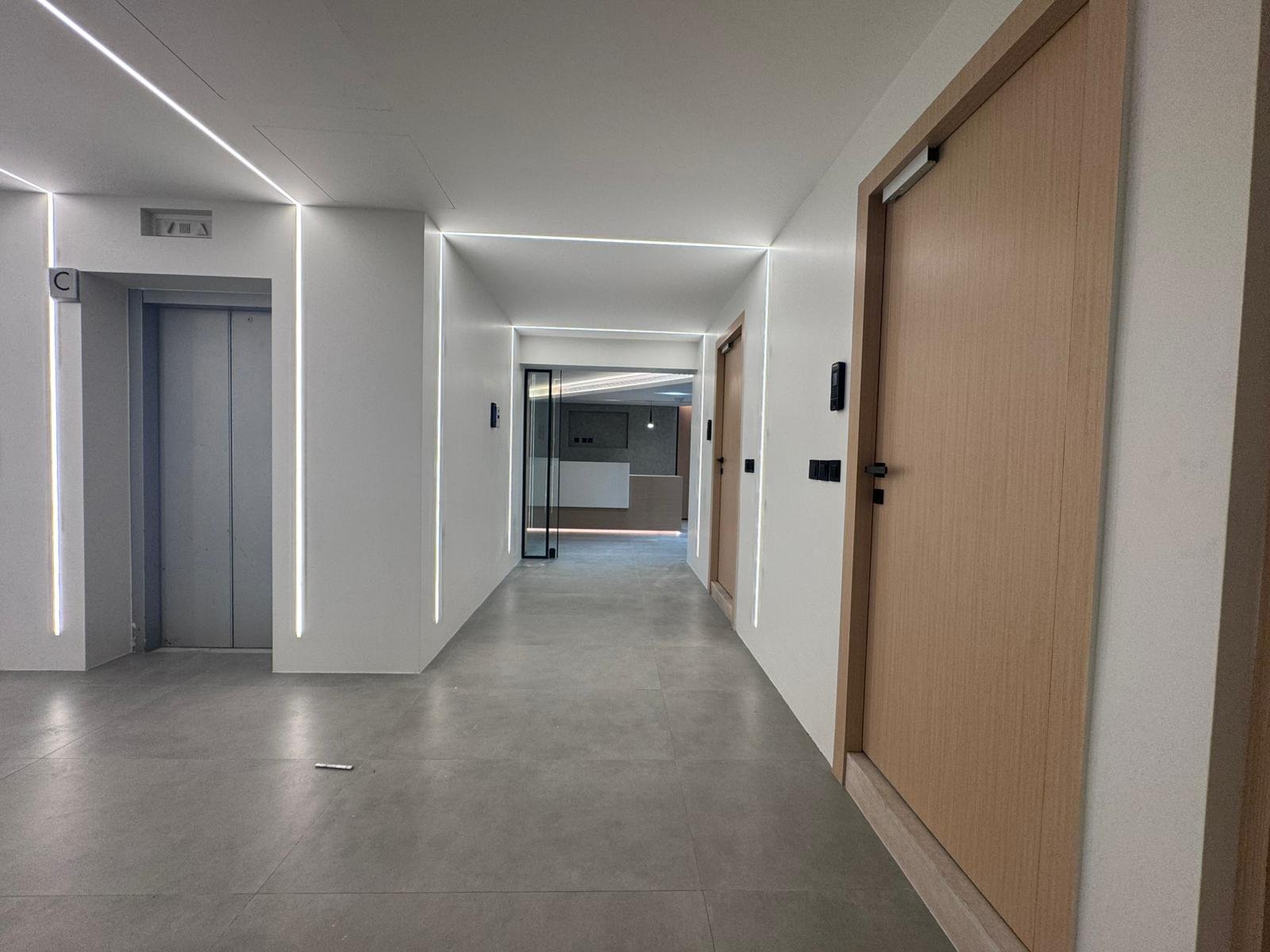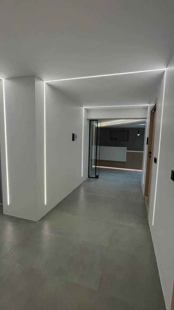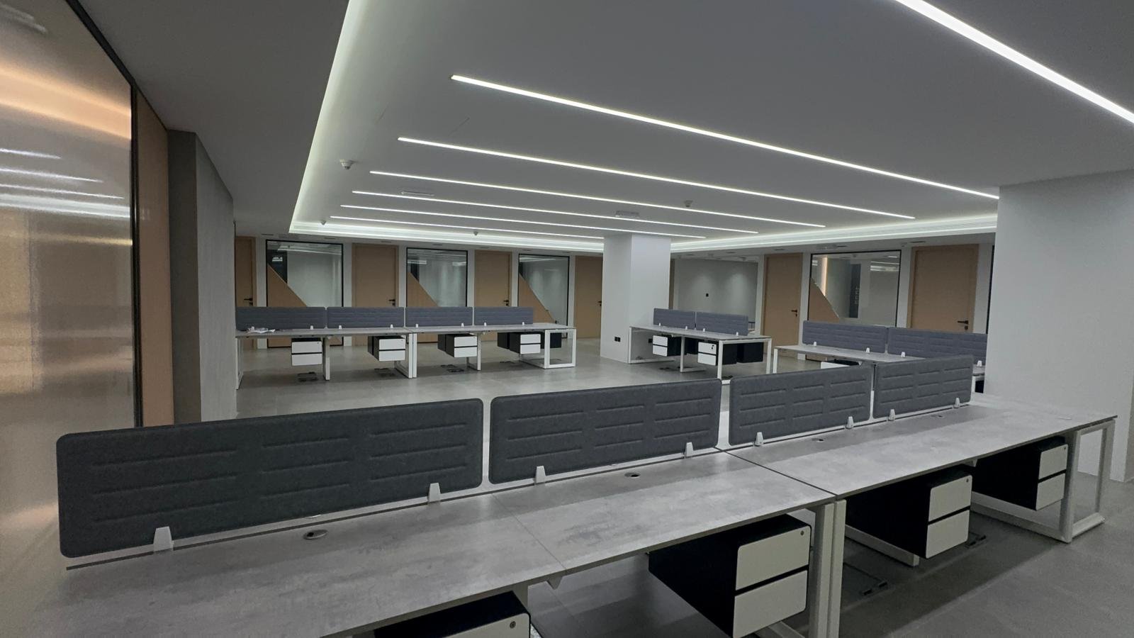 A contemporary office interior combining sleek reception, open-plan workstations, and executive offices. The design emphasizes clean geometry, warm wood, and integrated linear lighting to enhance productivity and sophistication.