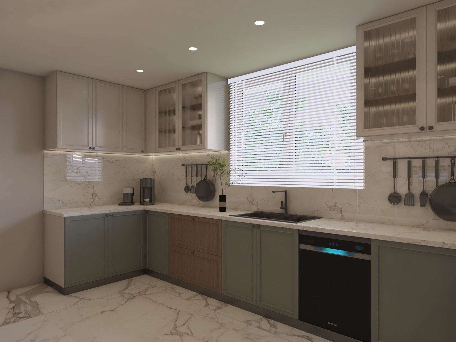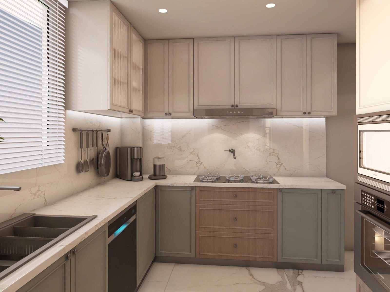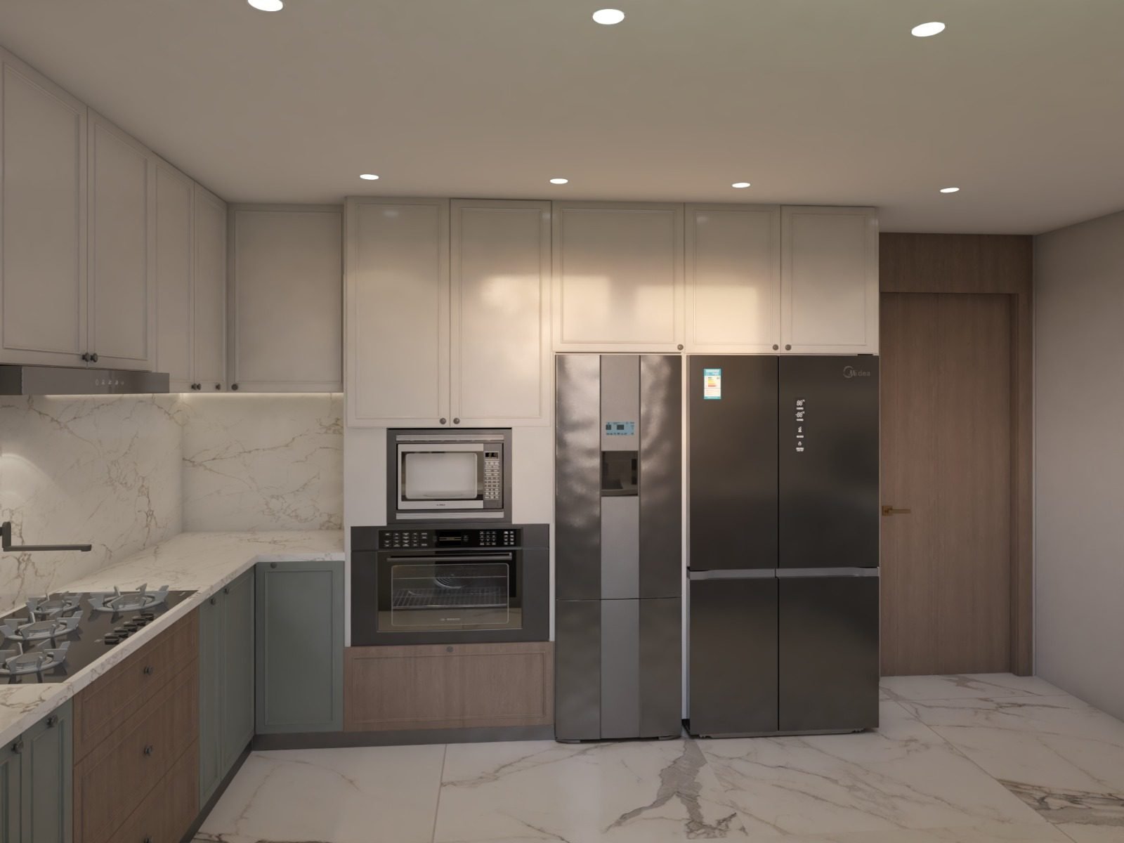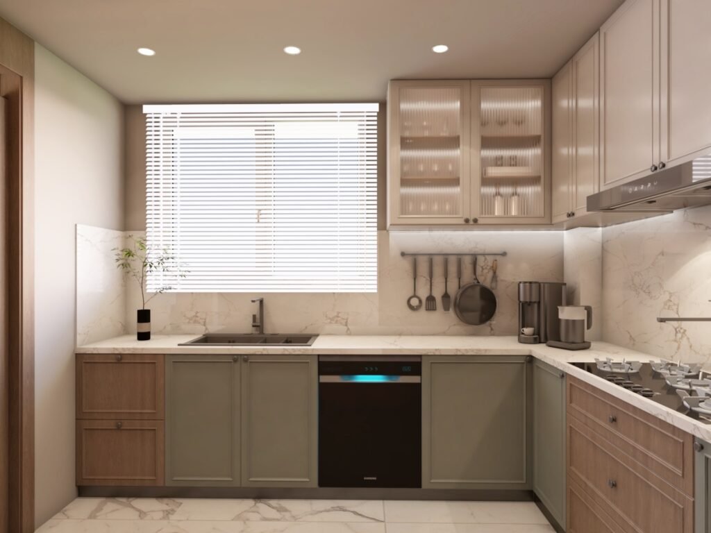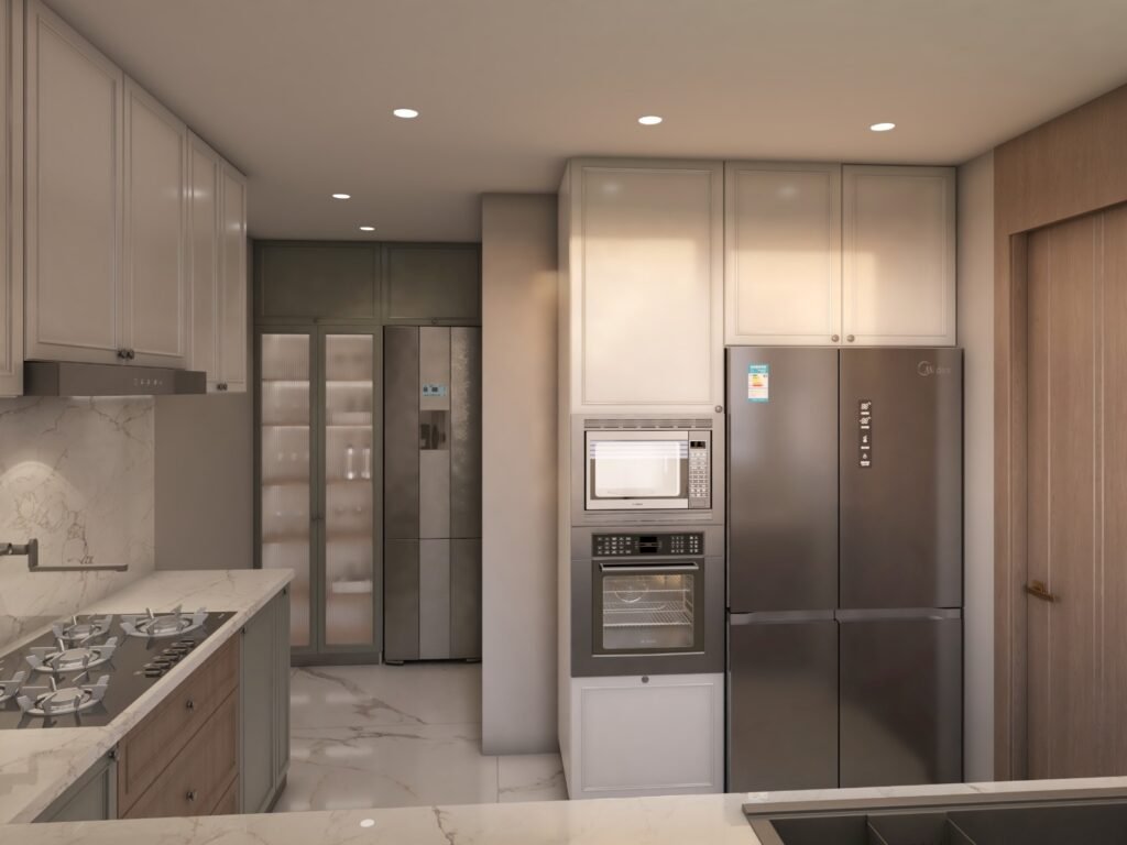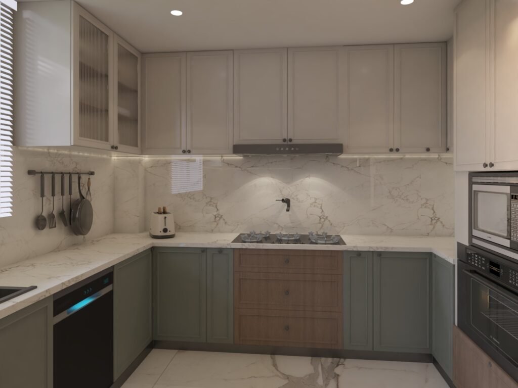 Functional kitchens designed with sleek cabinetry, marble finishes, and efficient layouts. These contemporary designs maximize storage while maintaining a clean, warm, and modern residential aesthetic.