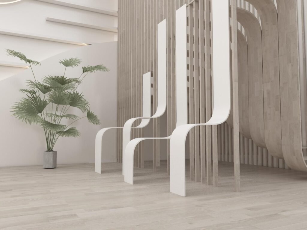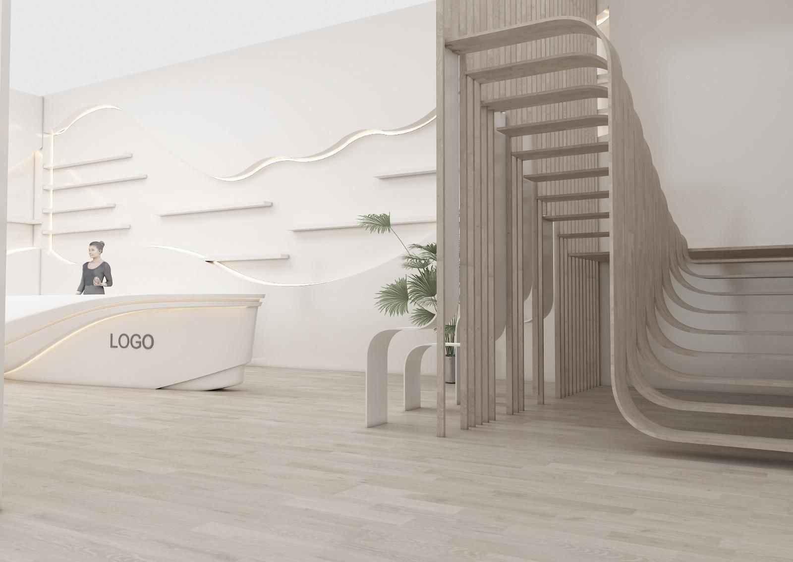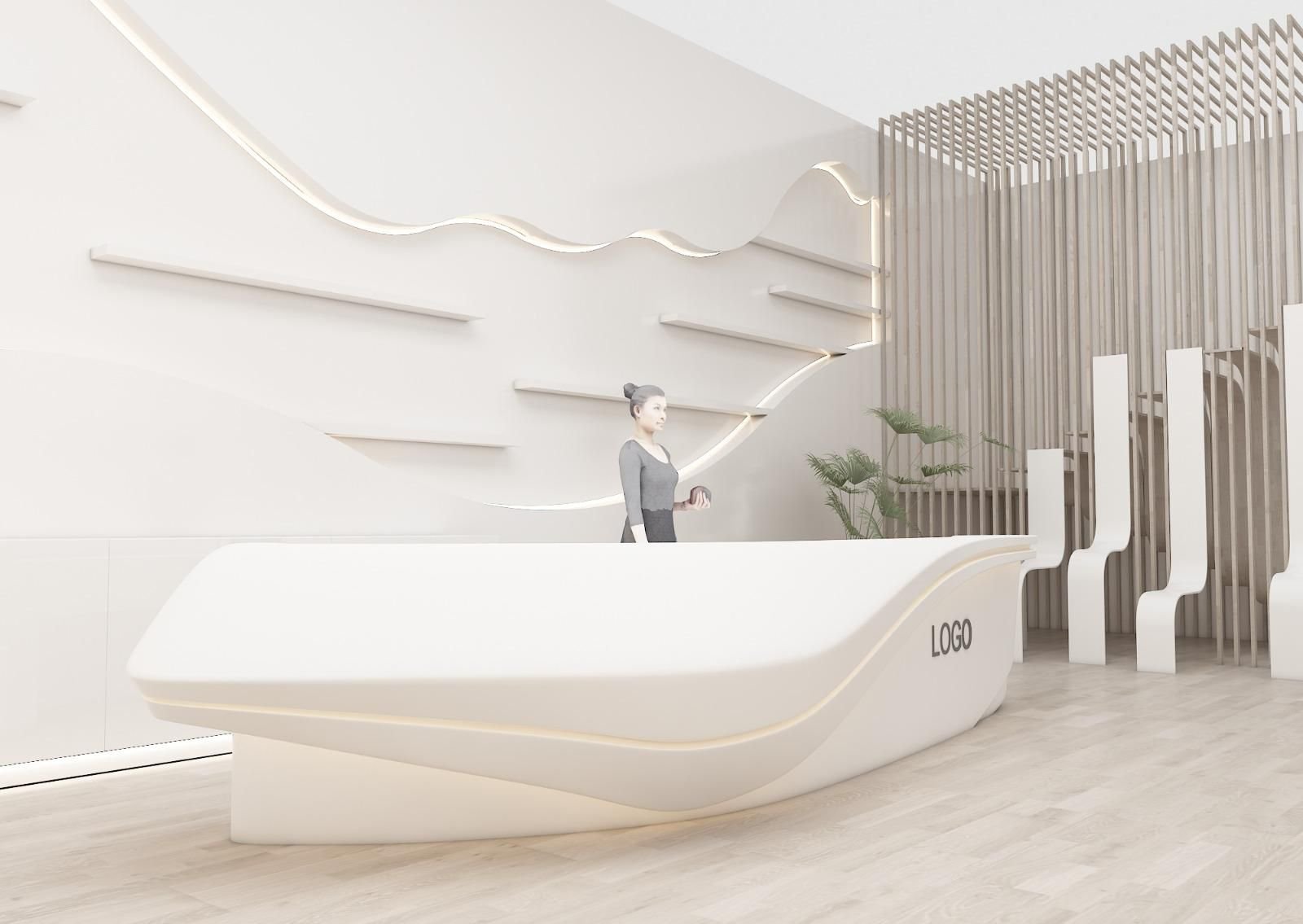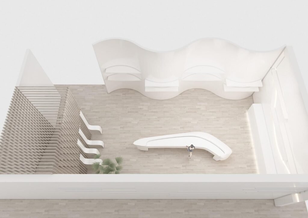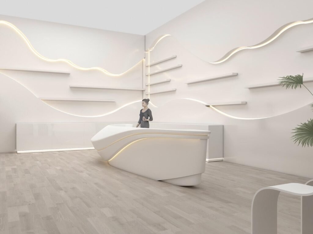 A futuristic lobby design featuring flowing walls, custom seating, and organic lighting.